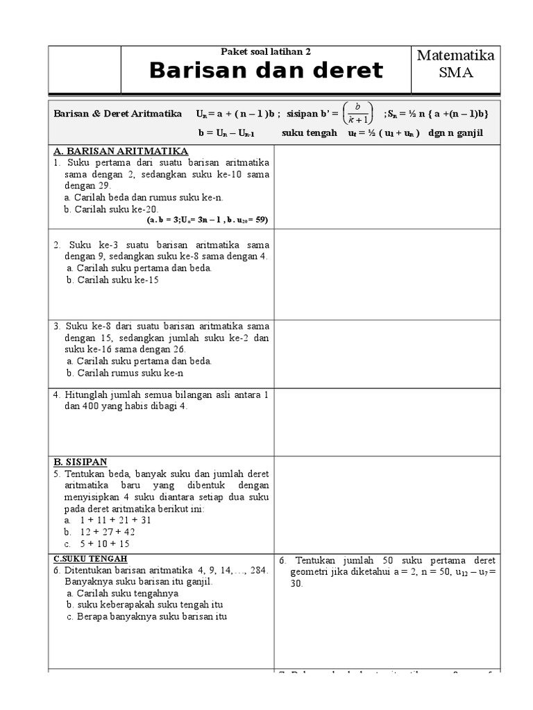Contoh soal deret aritmatika beserta jawabannya dan pembahasannya bisa untuk kelas 6 7 8 9 10 dan kelas 11 sd smp sma smk dan untuk tes kerja. Posting pada matematika s1 sma ditag 5 contoh barisan aritmatika aritmatika dasar barisan dan deret kuliah contoh deret hitung contoh soal aritmatika dan jawabannya contoh soal banyak suku barisan aritmatika contoh soal baris geometri contoh soal barisan aritmatika sma contoh soal barisan dan deret geometri contoh soal barisan dan. Menentukan suku ke n un jika beberapa suku diketahui.