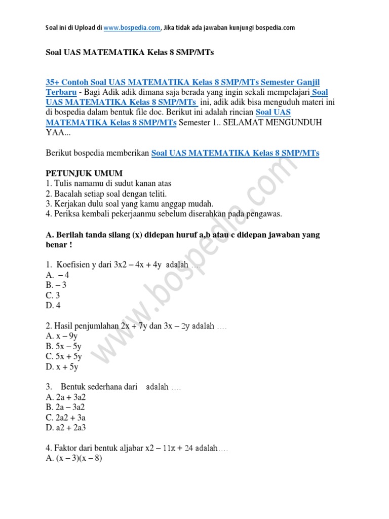 Soal Pts Uts Matematika Smp Mts Kelas 8 Semester 1 Kurikulum 2013 Kunci Jawaban Dan Pembahasan Kumpulan Artikel Menarik Seputar Dunia