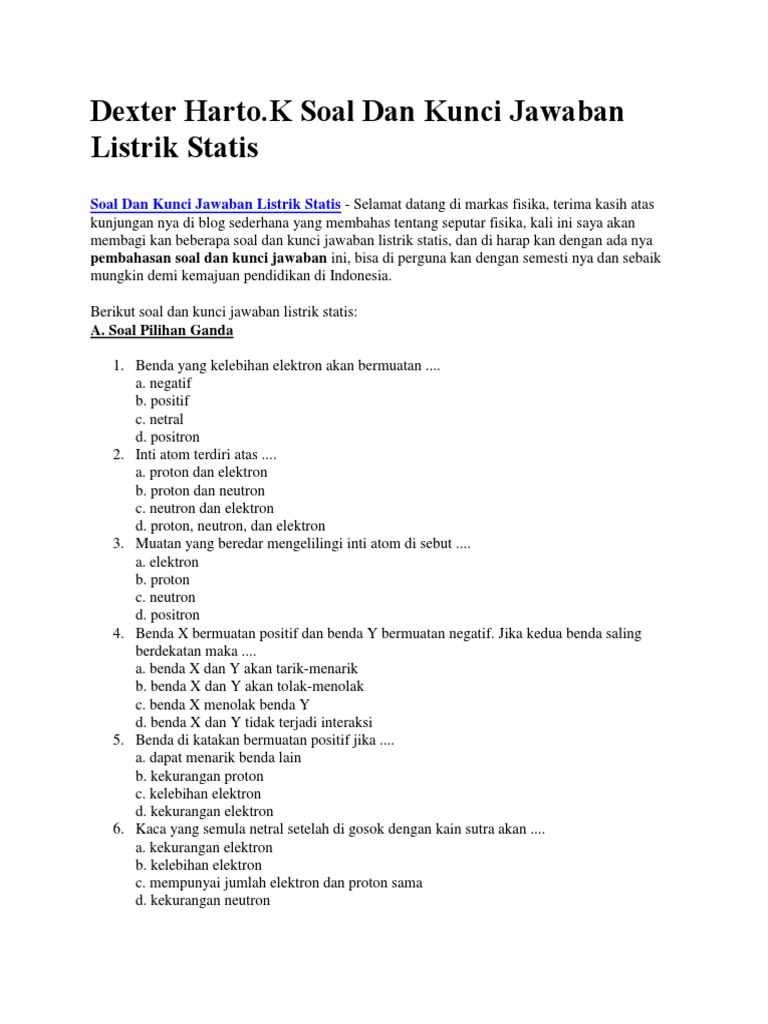 Dexter Harto K Soal Dan Kunci Jawaban Listrik Statis