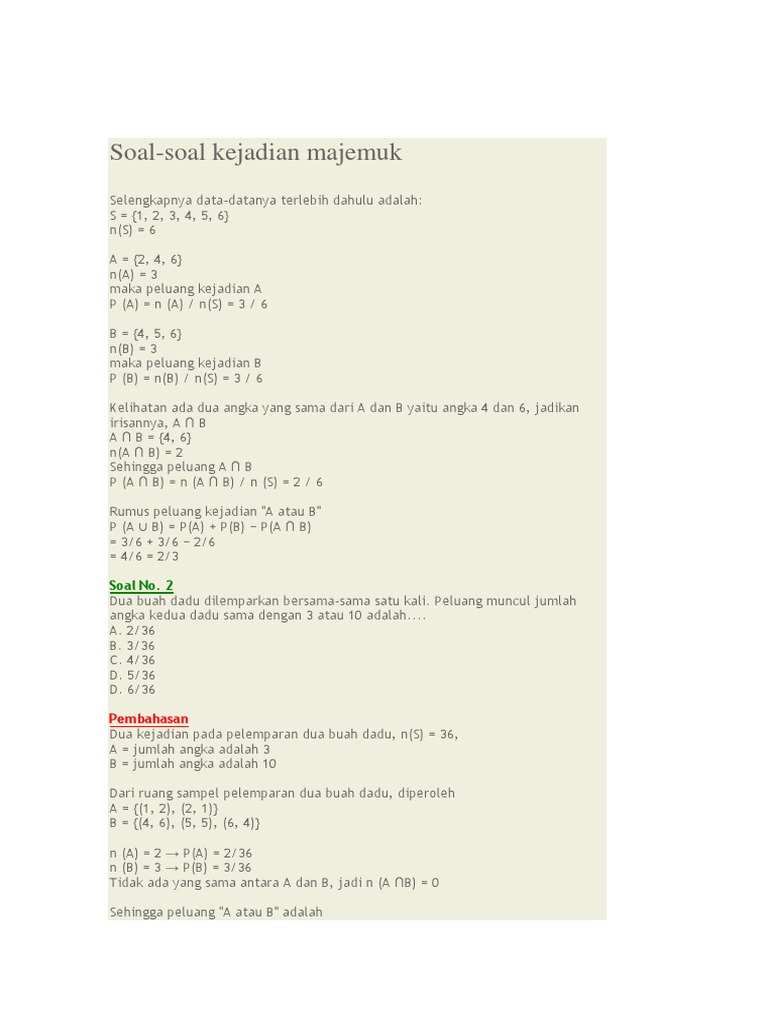 Contoh Soal Peluang Kejadian Majemuk Matematika Statistika Rumus Teori Pengertian Jawaban Konsep Komplemen Gabungan Saling Lepas Bebas