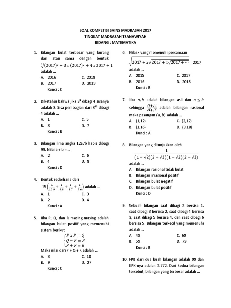 Soal dan kunci jawaban ksm tahun 2019 mi mts ma ksm 2019 lomba kompetisi sains madrasah 2019 tingkat kabupaten kota provinsi dan nasional untuk siswa siswi madrasah ibtidaiyah mi madrasah tsanawiyah mts madrasah aliyah ma dan sekolah sekolah diluar madrasah telah diselenggarakan. Contoh soal ksm 2020 dilengkapi dengan kunci jawaban untuk mi mts dan ma ini sebagai bahan pembelajaran menjelang pelaksanaan kompetisi sains madrasah tingkat satuan pendidikan kabupatenkota dan provinsi. Ksm mts cek latihan soal ksm mts terintegrasi 2019 dan jawaban jumlah keseluruhan soal admin sesuaikan dengan naskah asli yang bakal diujikan pada ksm tingkat kabupatenkota.