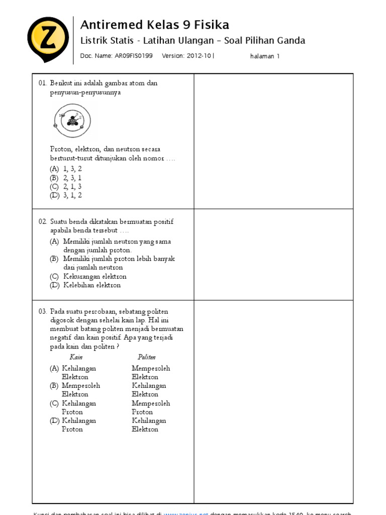 7705113 Soal Listrik Statis Smp Kelas Ix Doc Latihan I Listrik Statis 1 Bagian Dari Atom Yang Bermuatan Negatif Adalah U2026 A Positron B Proton C Course Hero