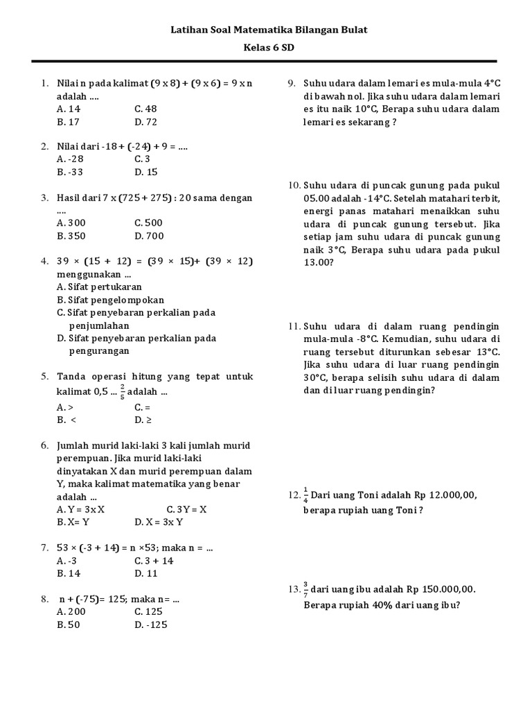 Doc Soal Matematika Kelas 6 Sd Semester I Ulangan Bab 1 Bilangan Bulat Muh Ricky Academia Edu