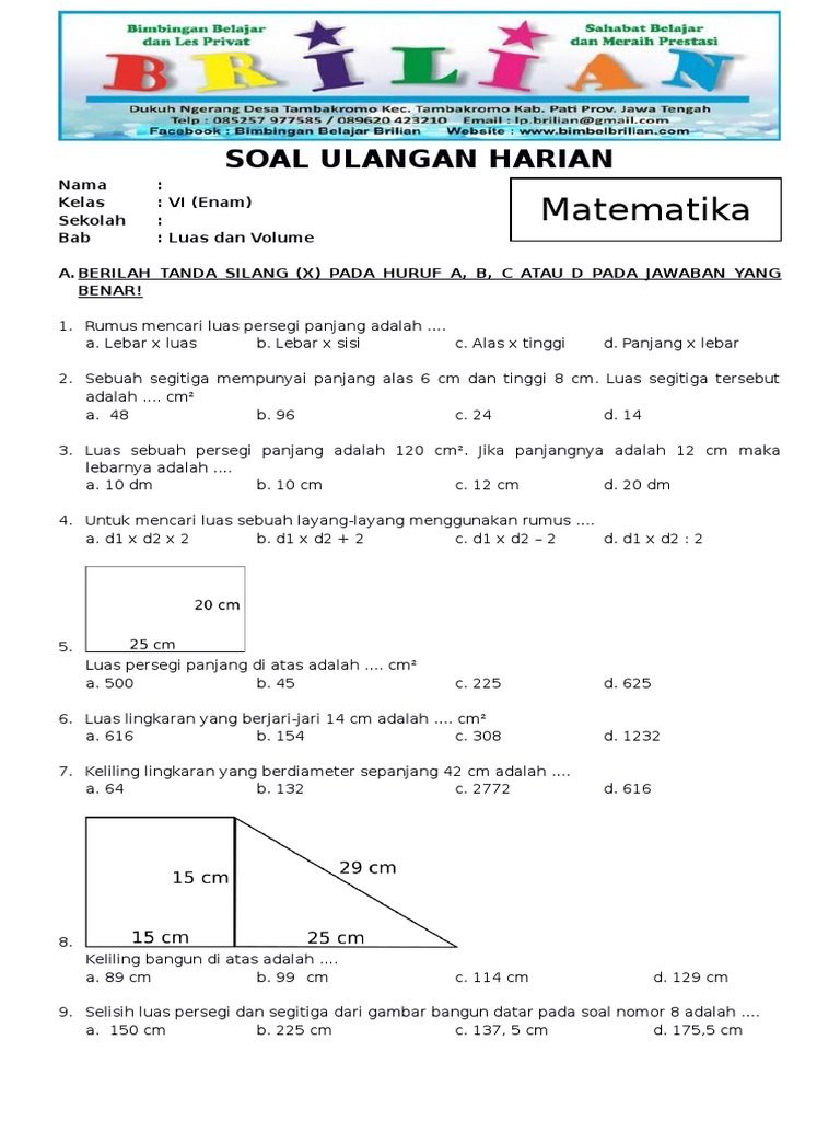 Luas Dan Keliling Bangun Datar 1 Soal Kelas 6 Sd 1 Rumus Luas Persegi Panjang Adalah A B C D Pdf Free Download