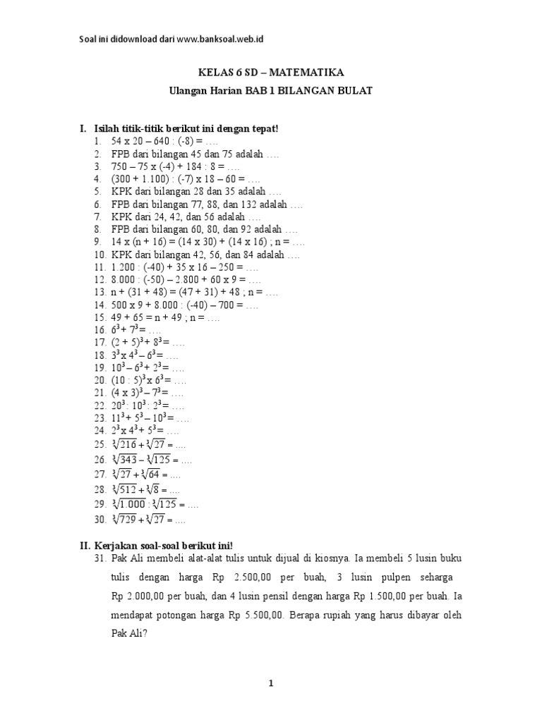 Soal Ulangan Harian Matematika Kelas 4 Ktsp Bab Bilangan Bulat Smstr 2 Www Tersatu Com