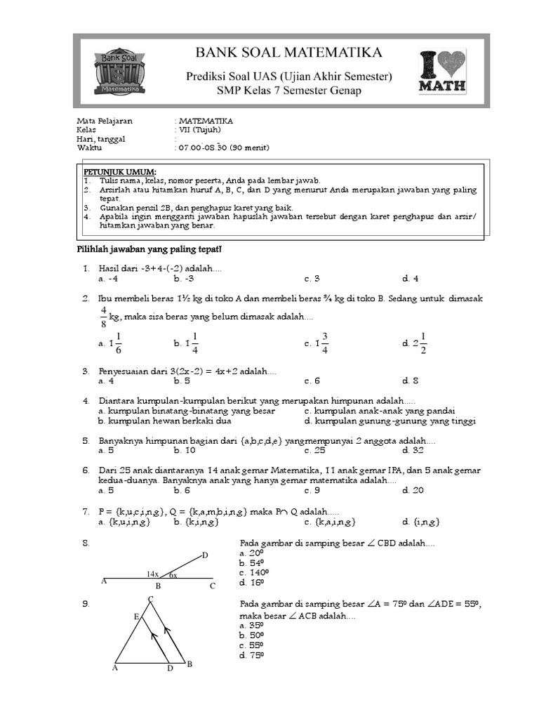 Kumpulan Soal Uas Matematika Smp Kelas 7 Semester 1 Soalujian Net