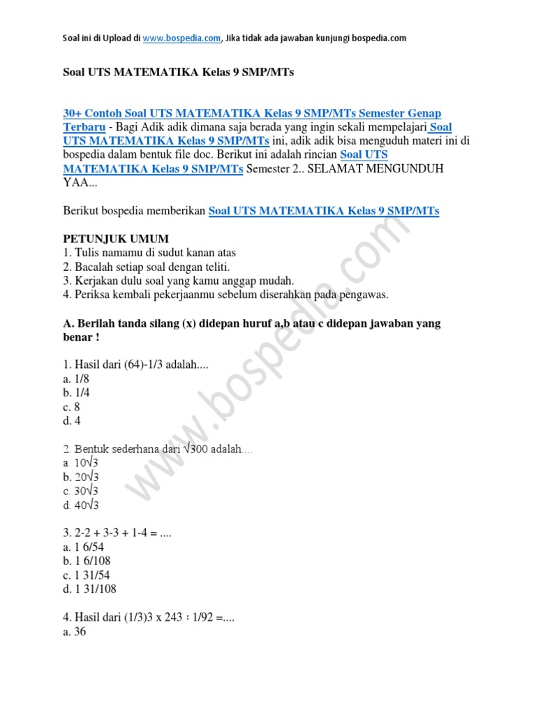 Kisi Kisi Soal Dan Kunci Jawaban Matematika Smp Kelas 7 Pas Semester Ganjil Didno76 Com