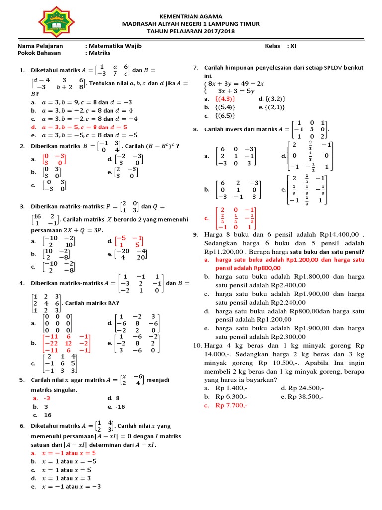 Contoh Soal Matriks Penjumlahan Pengurangan Perkalian Dan Campuran Plus Jawabannya
