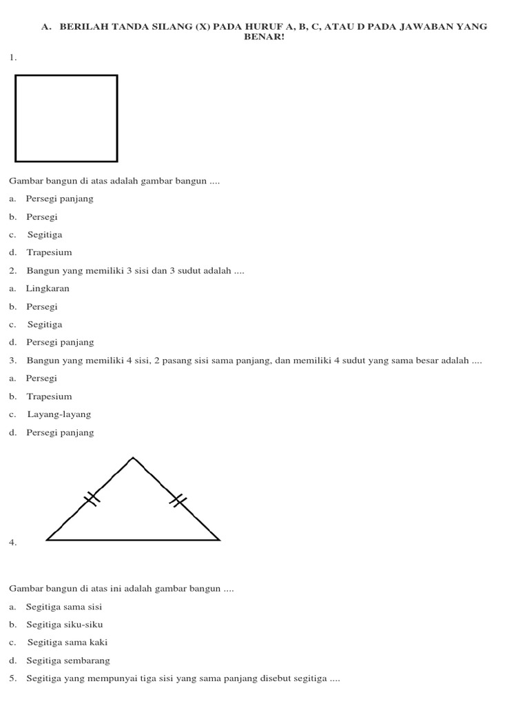 Jawablah soal soal segi banyak berikut dengan pilihan yang tepat. Segi banyak dan sudut subtema 1 2 dan 3 kelas iv semester 1. Berilah tanda silang x pada huruf a b c atau d pada jawaban yang benar.