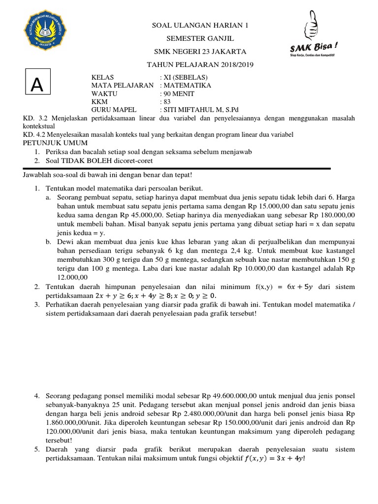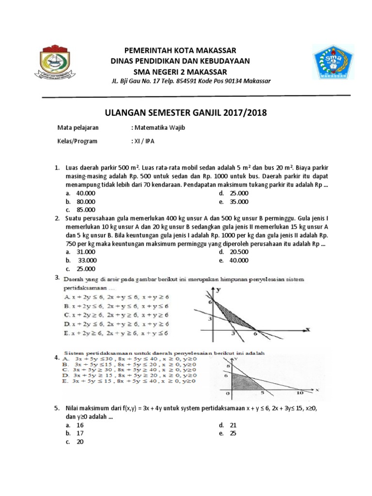 Soal Soal Sekolahan Soal Ulangan Harian Program Linear Matematika Kelas Xi Sma Ma Ipa Kurikulum 2013 Dan Pembahasannya