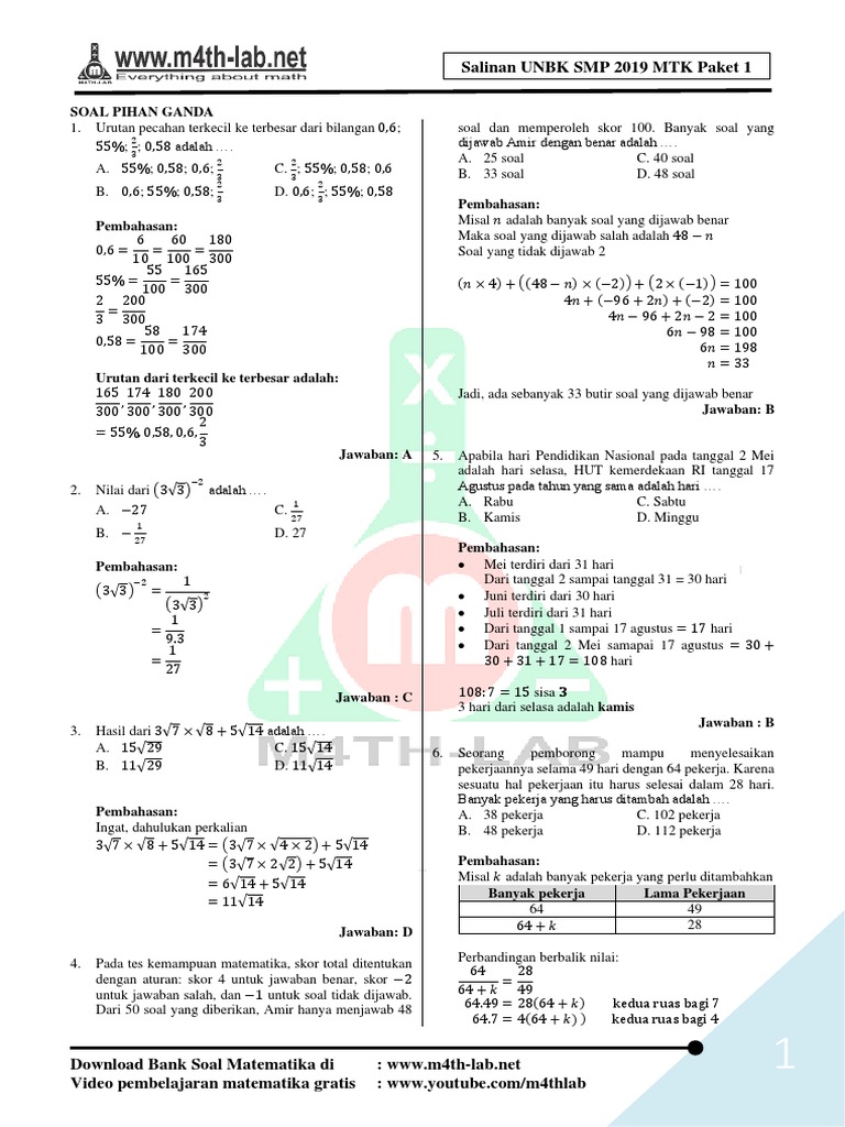 40 Soal Dan Pembahasan Simulasi Unbk Matematika Smp Tahun 2021 Paket A Defantri Com