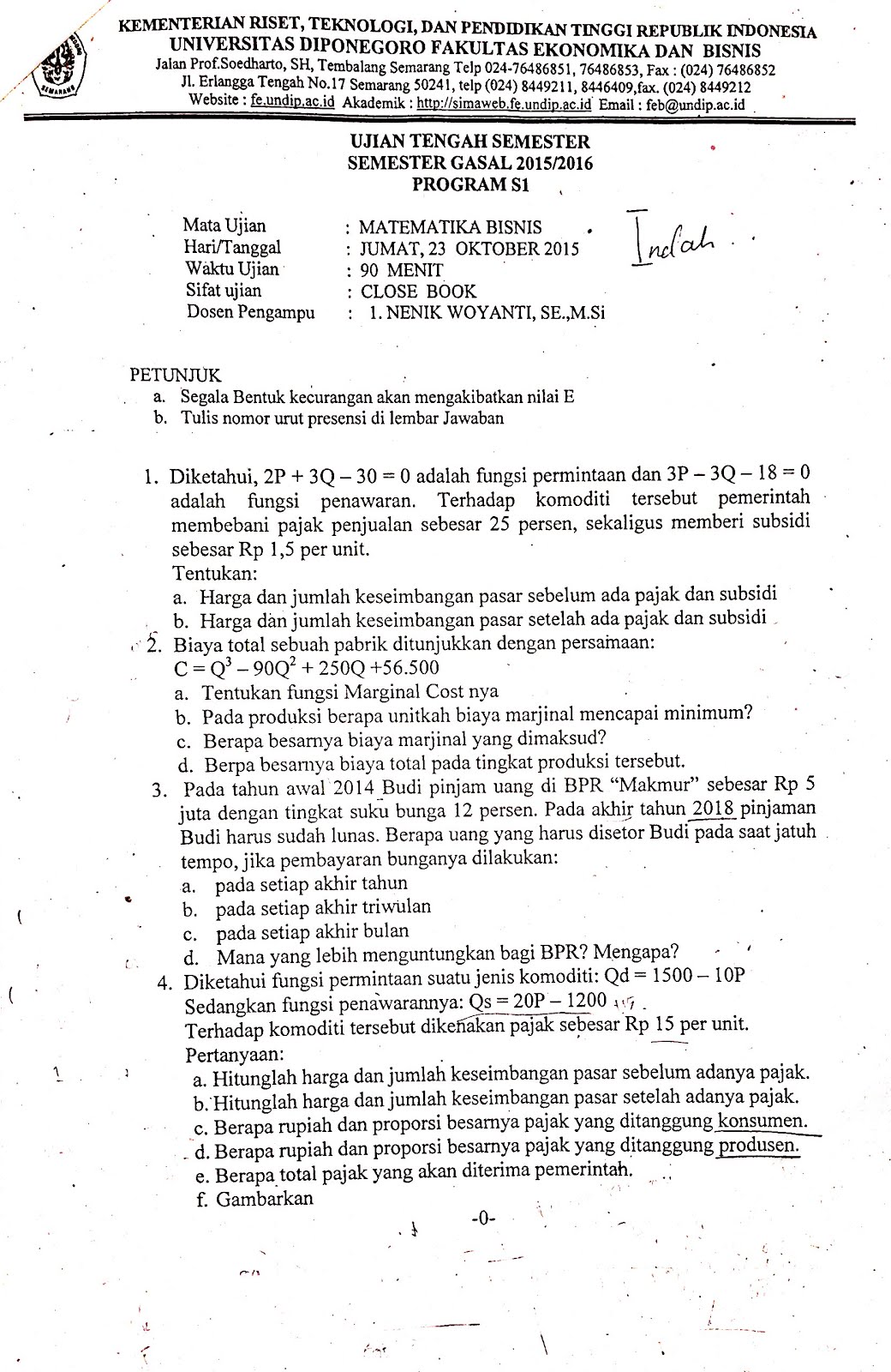 Soal Uts Matematika Ekonomi 1617