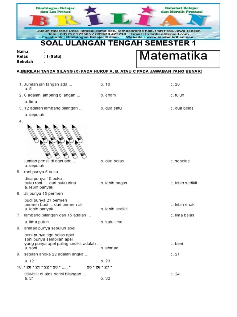 Soal Uts Matematika Kelas 1 Sd Semester 1 Ganjil Terbaru Lengkap Kunci Jawaban Infoloh Com