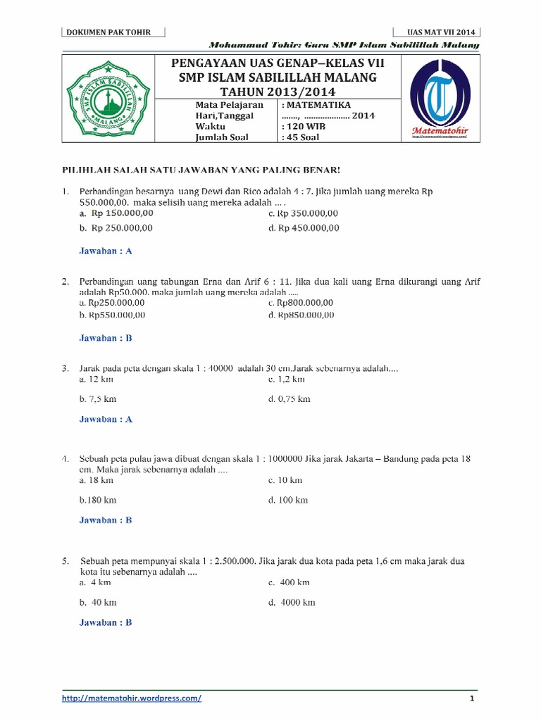 Download Soal Uas Matematika Kelas 7 Smp Mts Semester 1 2018 2019 Dan Pembahasan Dokumen Pengajaran Guru