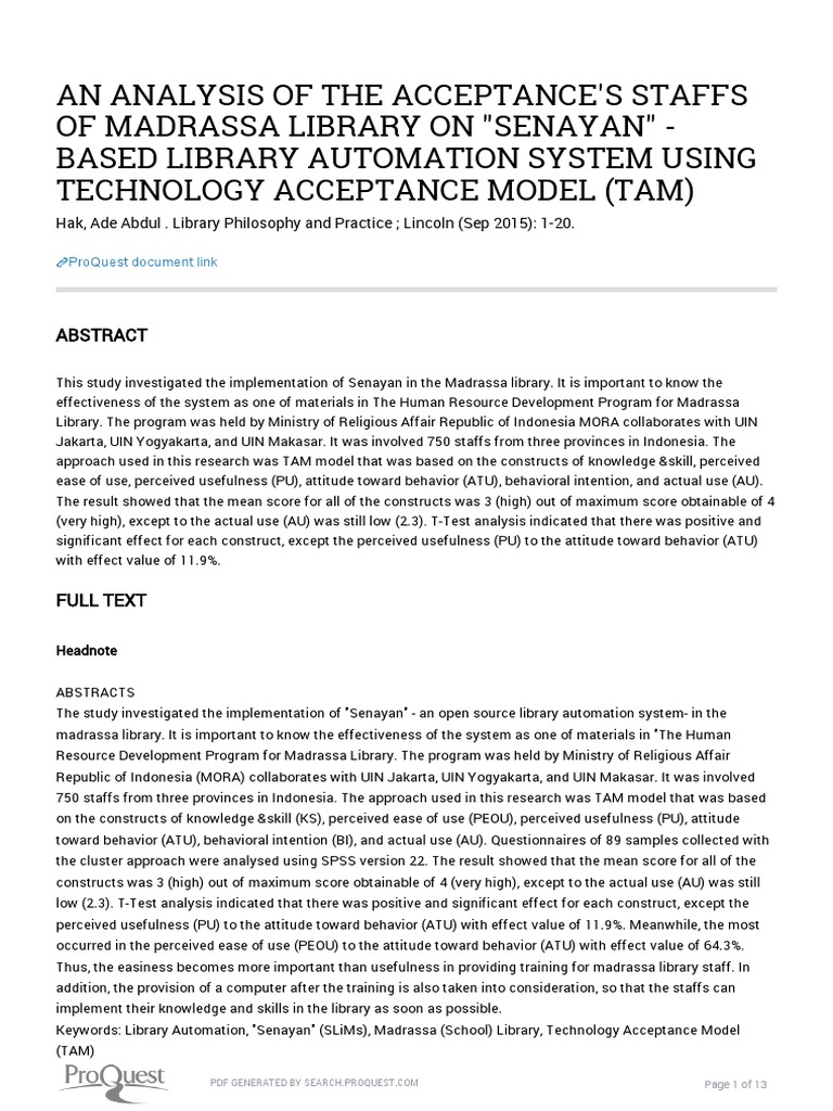 An Analysis Of The Acceptance S Staffs Of Madrassa Library On Senayan Based Library Automation System Using Technology Acceptance Model Tam Attitude Psychology P Value