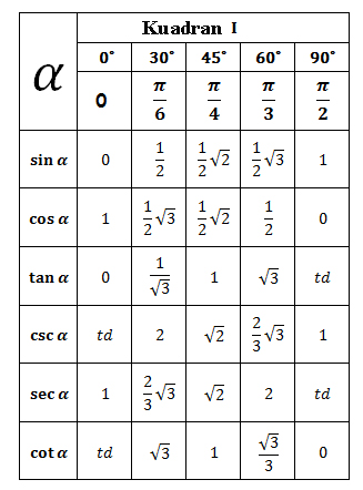 Penting untuk diperhatikan bahwa untuk menghitung secara umum fungsi trigonometri. Itulah tabel nilai trigonometri sudut istimewa secara lengkap yang bisa kami buatkan dan jelaskan kepada kalian semua sekali lagi kami ingatkan bahwa pelajaran tentang trigonometri matematika memang sulit tetapi trigonometri matematika sangatlah penting sehingga kalian sebagai pelajar baik pelajar tingkat smp maupun sma harus benar benar mengerti tentang fungsi trigonometri dan rumus trigonometri dasarnya karena didalam ujian sekolah maupun ujian nasional pun sering keluar. Nah kali ini kami akan sajikan sebuah tabel yang dapat menunjukkan semua nilai trigonometri dari semua sudut mulai dari 0 sampai dengan 900.