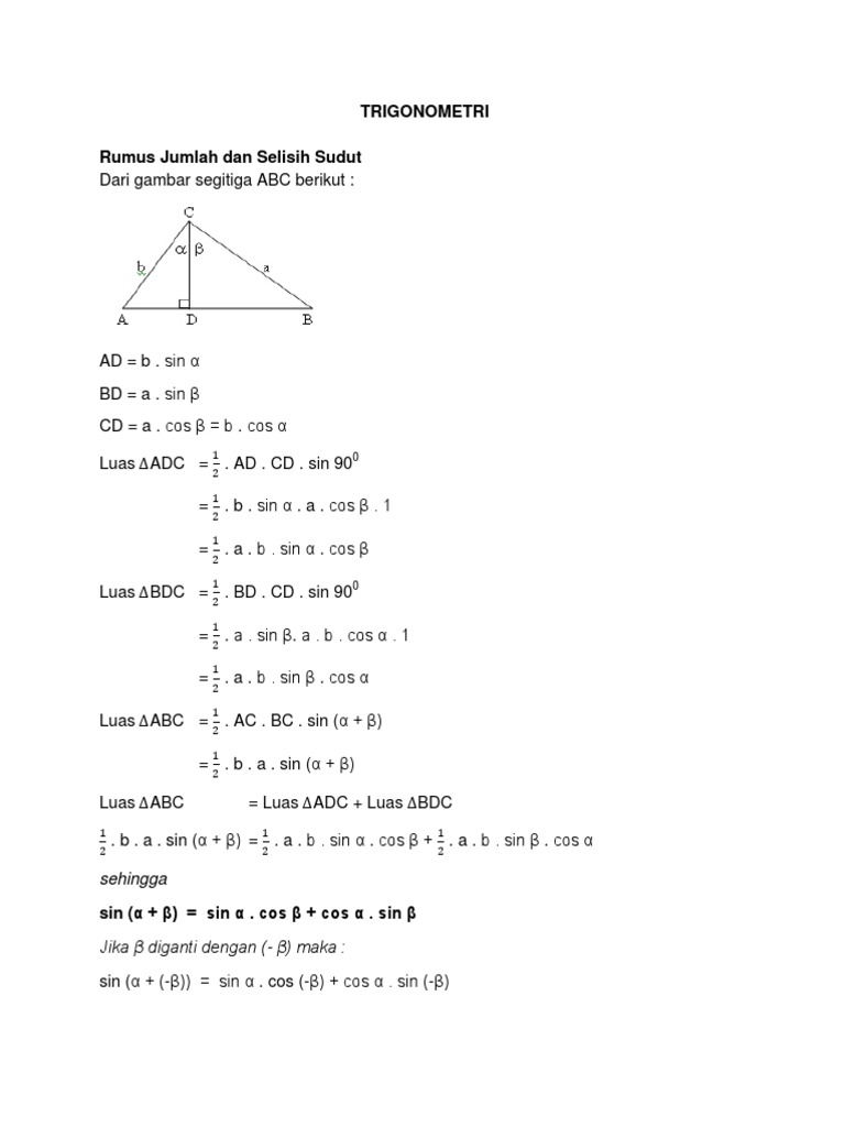 Trigonometri A Trigonometri Rumus Jumlah Dan Selisih Sudut Identitas Sudut Ganda Setengah Sudut Konversi Kali Ke Jumlah Kurang Jumlah Kurang Ke Kali Pdf Document