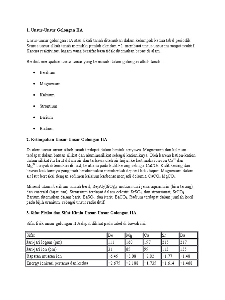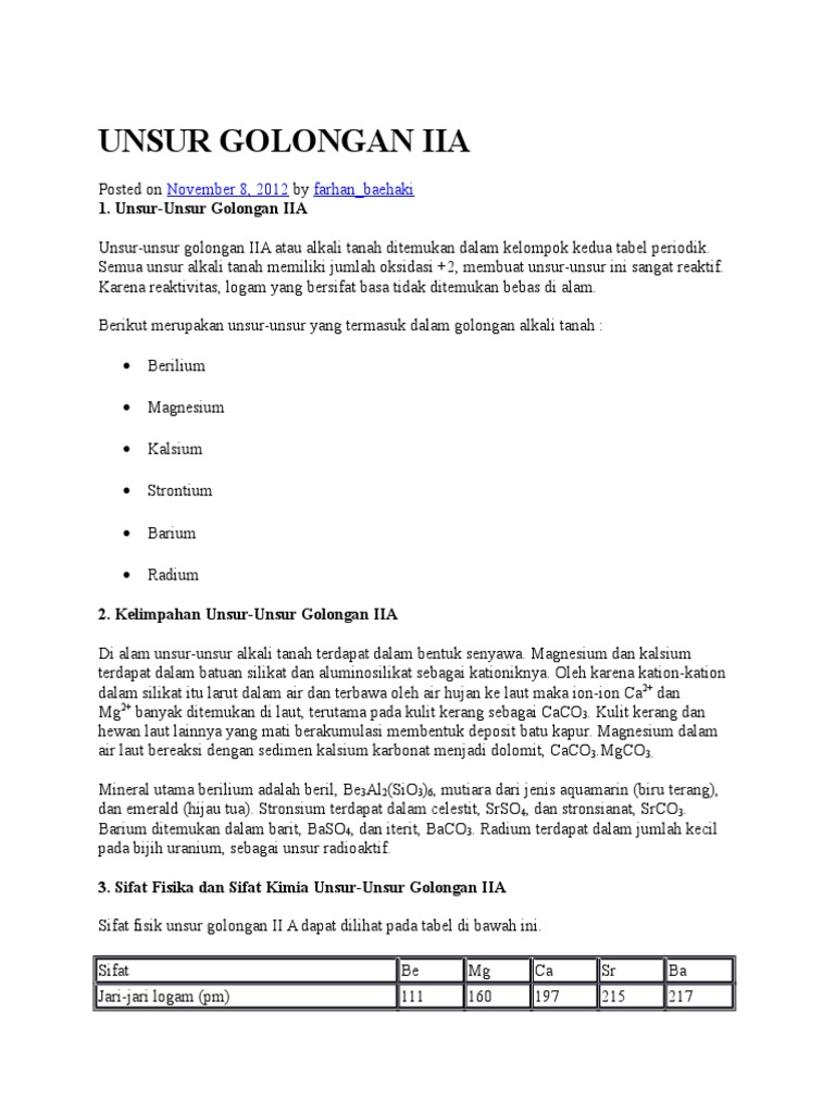 Golongan iia alkali tanahkimia unsur on 04102015 08102015 by amaldofirjarahaditane dalam kelas xii dalam golongan alkali tanah sifat sifat dari golongan alkali berkurang ke alkali tanah. Semua unsur alkali tanah memiliki jumlah oksidasi 2 membuat unsur unsur ini sangat reaktif. Kimia unsur golongan 1a 2a 1.