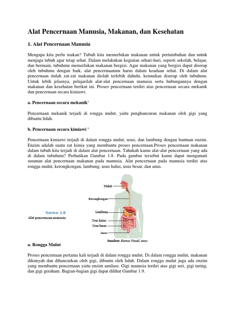 Zat makanan yang sudah mengalami pencernaan secara kimia adalah. Proses pencernaan makanan pada manusia melibatkan alat alat pencernaan makanan. Selain itu juga terjadi penyerapan air vitamin mineral dan mengeluarkan sisa hasil pencernaan dari dalam tubuh. Makanan yang telah dimakan akan diuraikan dalam sistem pencernaan menjadi sumber energi komponen penyusun sel dan jaringan dan nutrisi yang dibutuhkan oleh tubuh.